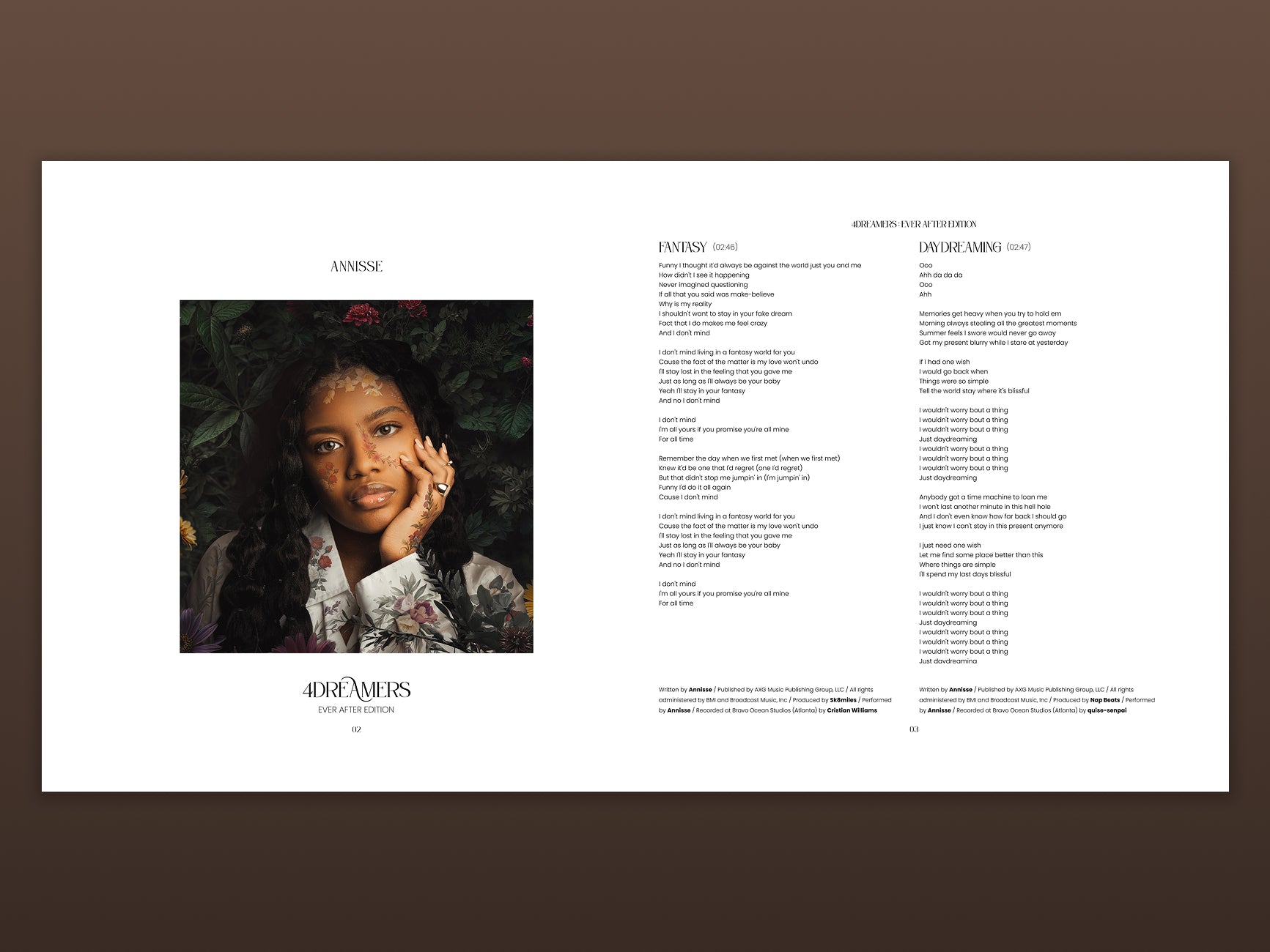 Annisse's 4DREAMERS: Ever After Edition is a conceptual body of work rooted in the four elements—air, water, earth, and fire—each song channeling a different essence of her soul. The extended EP is a collection of earlier "journal entries" that explore love, loss, healing, and self-discovery, carried by her velvety, soul-stirring vocals.